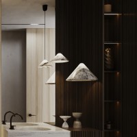 Lo que más nos gusta de FUJI es que está trabajada artesanalmente y que aporta un toque de suavidad, elegancia, minimalismo y refinamiento a cualquier interiorismo. El alabastro de su pantalla denota una gran calidez y le confiere un look espectacular cuando la luz se enciende, y presenta un aspecto muy bello cuando está apagada, pues cada pantalla es, en sí misma, una pequeña obra de arte de la Naturaleza, con identidad única, vetas irrepetibles y una suave traslucidez. **Al tratarse de un material 100% natural extraído de una cantera, la variedad de vetas blancas, marrones y grises es totalmente aleatoria**. Las estructuras, por otra parte, son simples y contrastan de un modo armonioso con la pesadez de la piedra. FUJI es perfecta para espacios con mucha clase tanto en viviendas como en proyectos de ‘retail’ o espacios de hostelería o restauración.